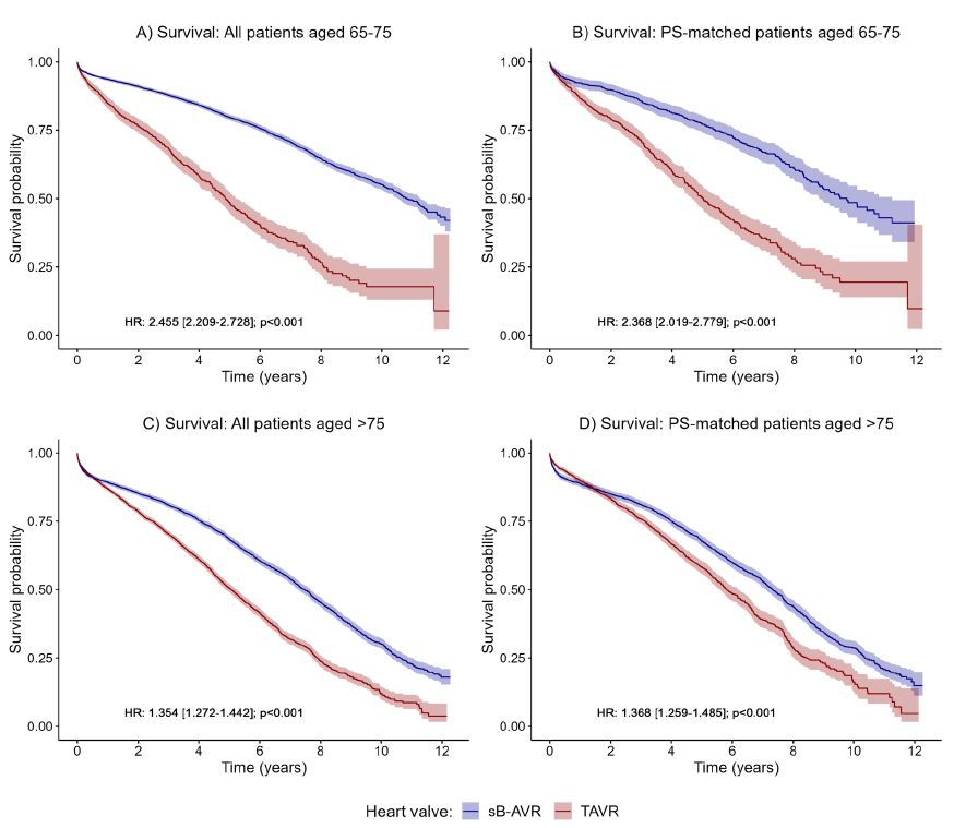 In patients ≥ 65 years aortic valve replacement with transcatheter aortic valve replacement (TAVR) was compared to surgically implanted bioprostheses (sBAVR), both in the overall cohort and propensity score-matched populations (PSMP). Overall survival was significantly impaired in patients with TAVR between 65-75 years of age, both in the overall cohort (HR = 2.455, p < 0.001) and the PSMP cohort (HR = 2.386, p < 0.001). This finding was also present in patients > 75 years (overall: HR = 1.354, p < 0.001; PSMP: HR = 1.368, p < 0.001)