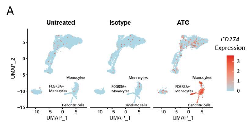 Fig. 2. ATG upregulated CD274 in monocytes from whole blood ex vivo. (A) Feature plot for CD274 of untreated, isotype- and ATG-treated white blood cells. Monocytes, FCGR3A+ monocyted and dendritic cells are annotated, red colour gradient inidicates expression level.